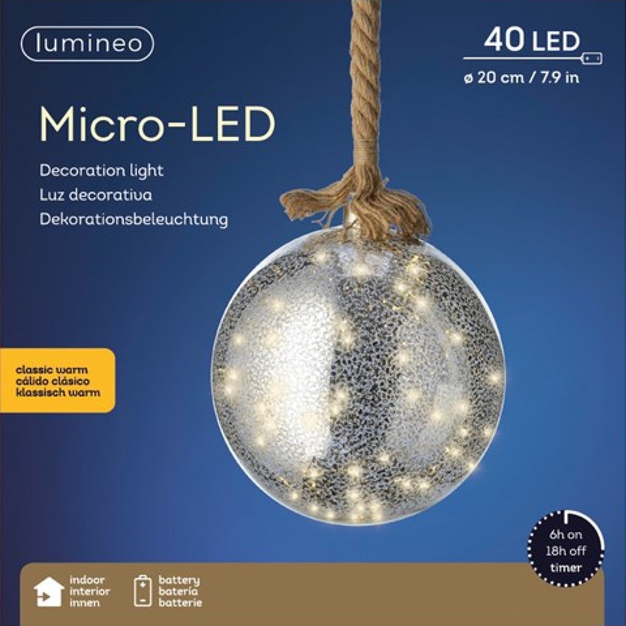 20cm Patterned Glass Battery Operated Micro-LED Light up Ball Decoration with 40 Warm White Lights