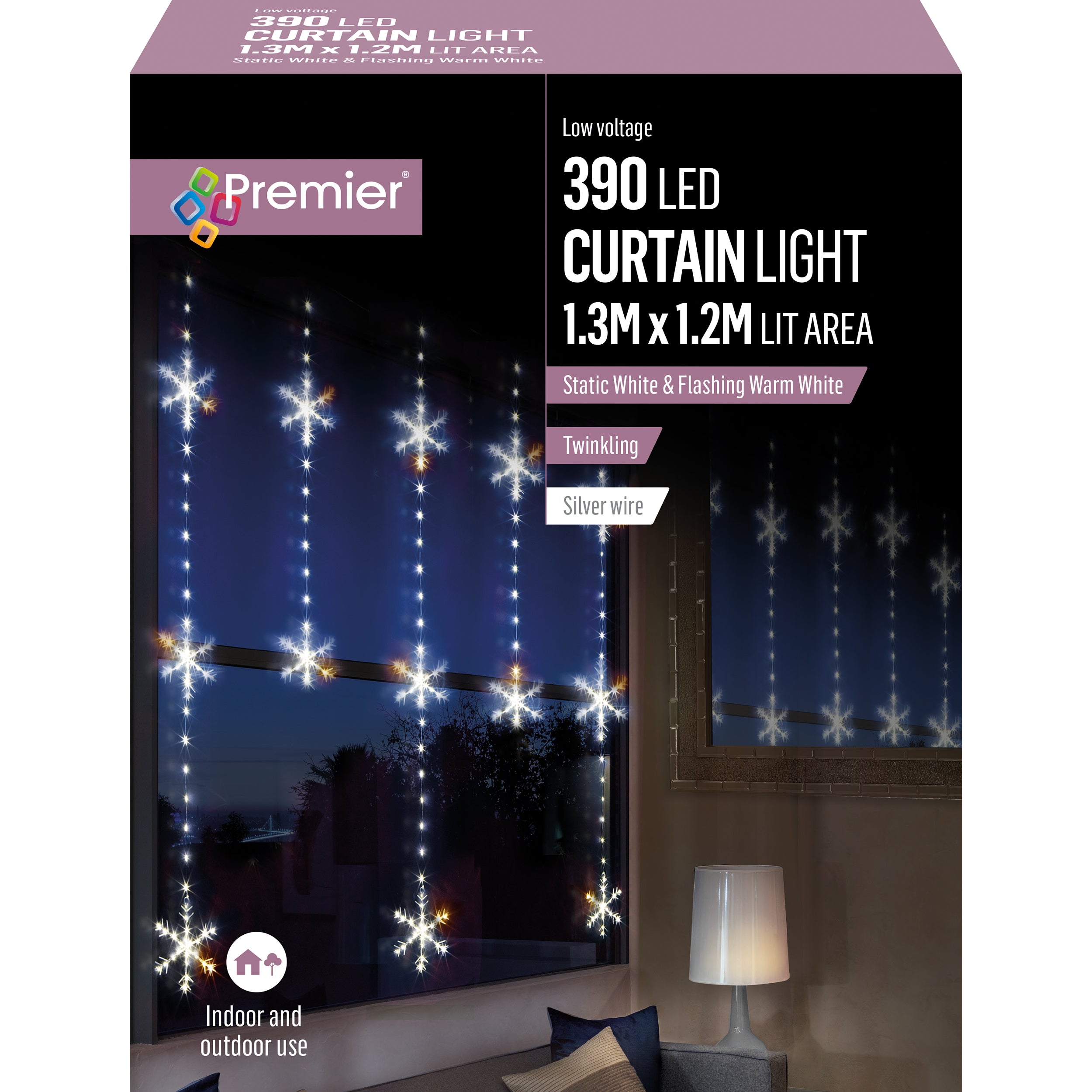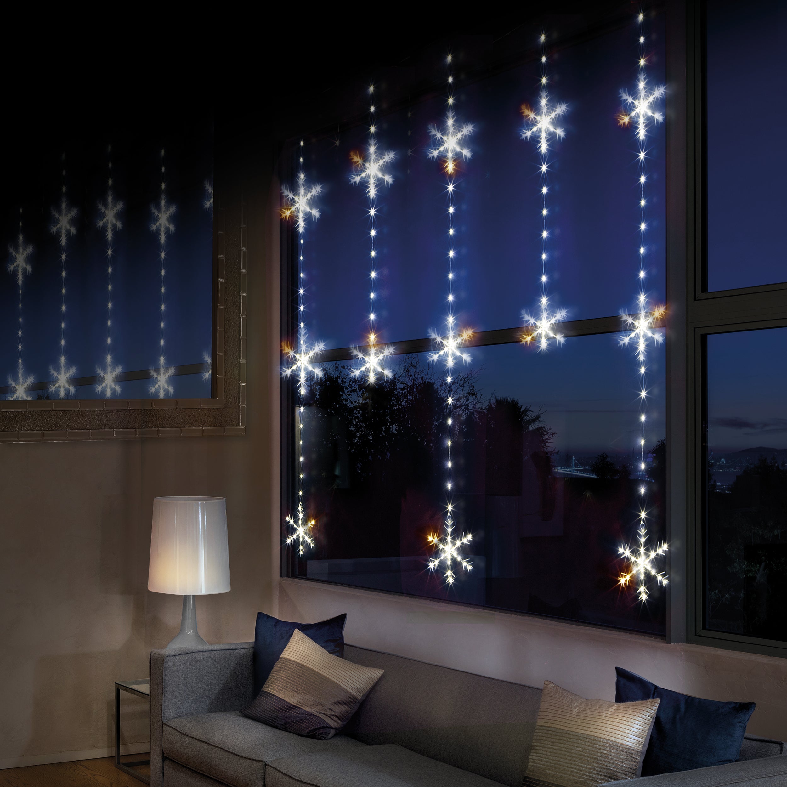 Stunning curtain-light decoration in a unique shape accented with snowflakes. All lit with over 300 white and warm white LEDs, the perfect addition to your window at Christmastime.