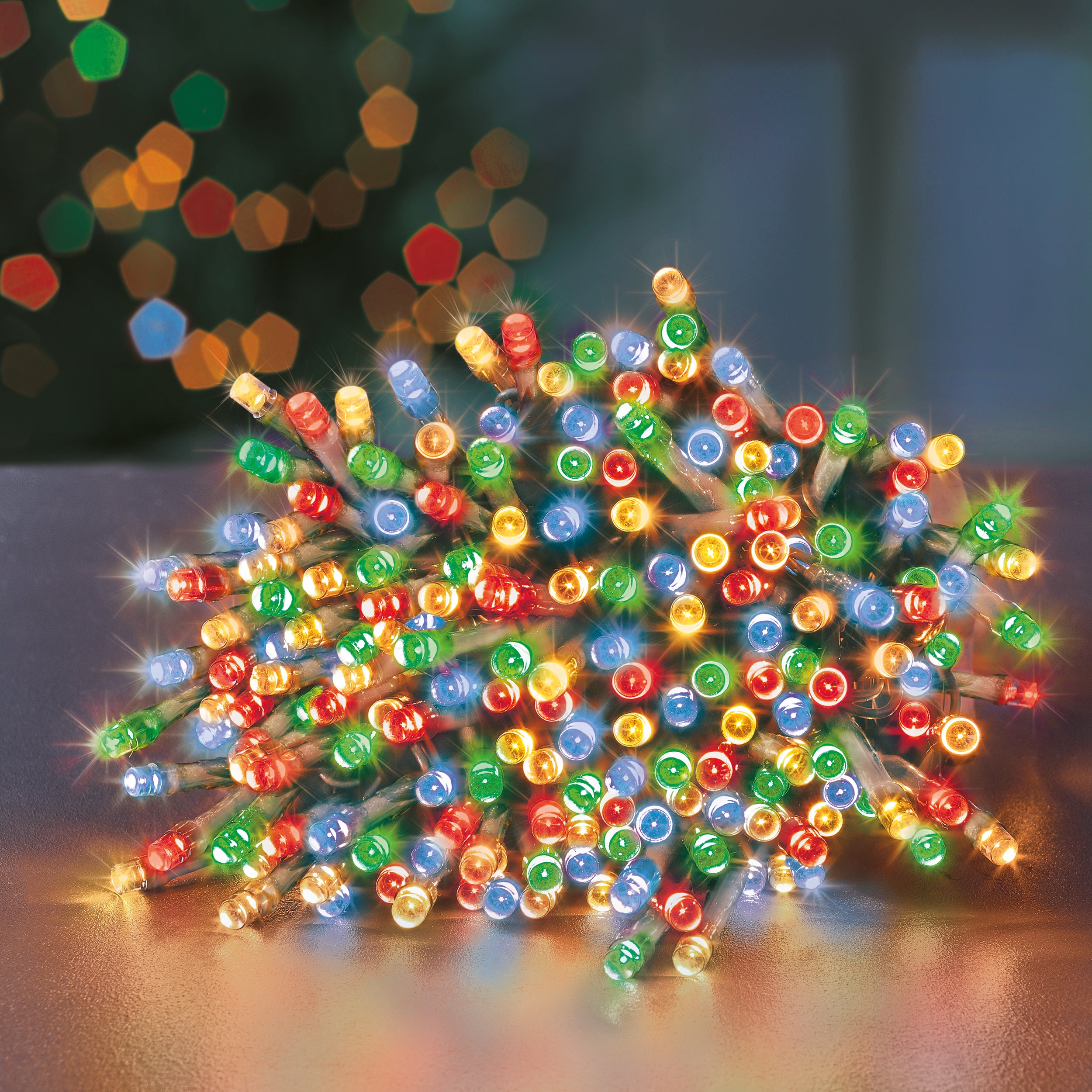 Multi-coloured LED Christmas lights with multi-action and timer feature